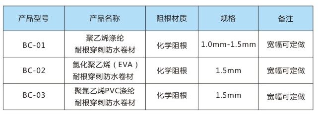 BC化學(xué)阻根耐根穿刺防水卷材是以高分子片 材(聚乙烯、氯化聚乙烯,聚氯乙烯,EVA )為胎基,以添加進(jìn)口化學(xué)阻根劑,通過特殊的擠出工藝,通過對(duì)雙面材料,高分子體系的防阻根處理,從根本上阻止了植物根尖穿透防水層,同時(shí)不影響植物的生長(zhǎng),確保植物根尖對(duì)防水層的不破壞,是建筑種植綠化優(yōu)選的耐根穿刺防水材料。
